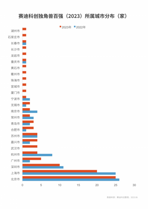 (二)城市格局:三強格局基本穩(wěn)固,兩家以上獨角獸百強城市再度擴容