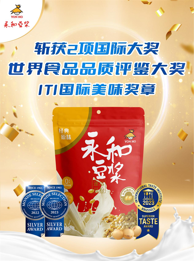 永和豆?jié){一路走來(lái),不斷追求卓越品質(zhì),積極對(duì)標(biāo)嚴(yán)格的國(guó)際標(biāo)準(zhǔn),打造營(yíng)養(yǎng)美味的豆?jié){產(chǎn)品。2022-2023年,永和豆?jié){旗下經(jīng)典原味豆?jié){粉350g憑借專(zhuān)業(yè)配方和匠心工藝,連續(xù)斬獲蒙特獎(jiǎng)和ITI國(guó)際美味獎(jiǎng),閃耀世界舞臺(tái)。